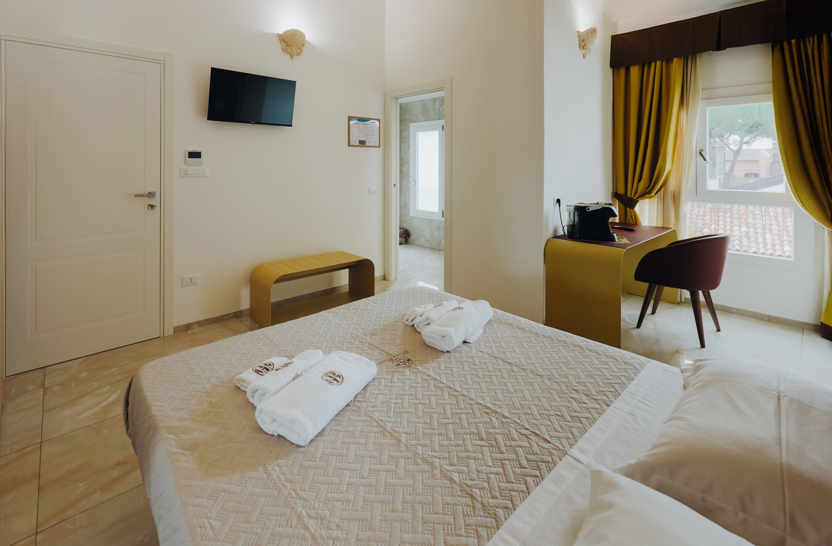 Accogliente e luminosa, la camera dispone di un comodo letto matrimoniale, connessione Wi-Fi veloce, frigobar e televisione. Perfetta per una fuga romantica o un soggiorno di relax, la Camera San Pietro ti accoglie in un ambiente ristrutturato con cura, dove ogni dettaglio è pensato per il tuo benessere.